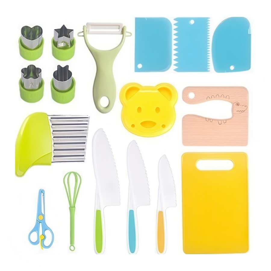 ROELLY Barnkniv, 22-delad säkerhetsbarnskärset, knivset för barn för att skära frukt och grönsaker, inklusive matlagningsförkläde, skärbräda, vågkniv