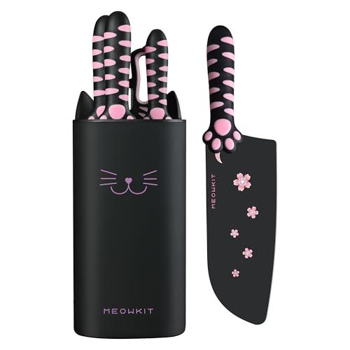 MEOWKIT Knivblockset, 5-delad skarp kökskniv i rostfritt stål, söt knivset med avtagbart block och sax, svart, rosa