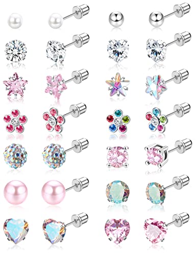 JeweBella 14 par små örhängen med knoppar set för kvinnor, flickor, allergivänliga, 316L kirurgiskt stål, örhängen för barn, söt blomma, pärla, hjärta, zirkonia-örhängen tragus brosk piercing,