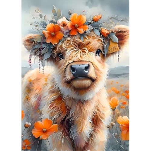 DPHERO DIY Highland Cow diamantmålningssatser för vuxna, 5D ko diamant konstkit för nybörjare, runda hela borrar blommor diamantmålning konst, gör-det-själv målning efter siffror diamantkonstmålning