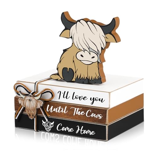 4 delar Highland Cow nivåbricka dekor mini trä bokstaplar bordsdekorationer högland ko träbok rustik bondgård högland ko bordsskylt för hem rum bord mantel öppen spis hylla