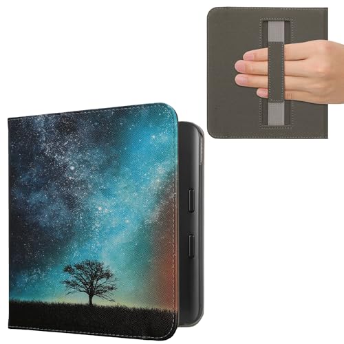 kwmobile Fällbart fodral kompatibelt med Kobo Kobo Libra Colour/Tolino Vision Color fodral – Flipfodral för eReader med handledsrem – galax träd äng blå grå svart