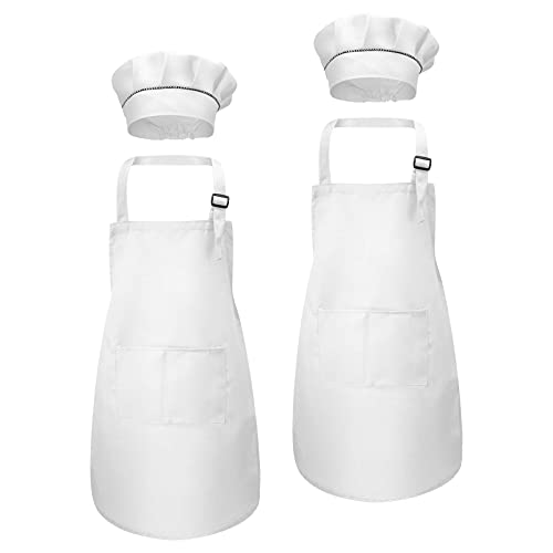 Vitt barnförkläde och kockhatt set, barnförkläden för bakning matlagning målning, justerbara förkläden med fickor för pojkar flickor småbarn ålder 6-13 år (2 set)