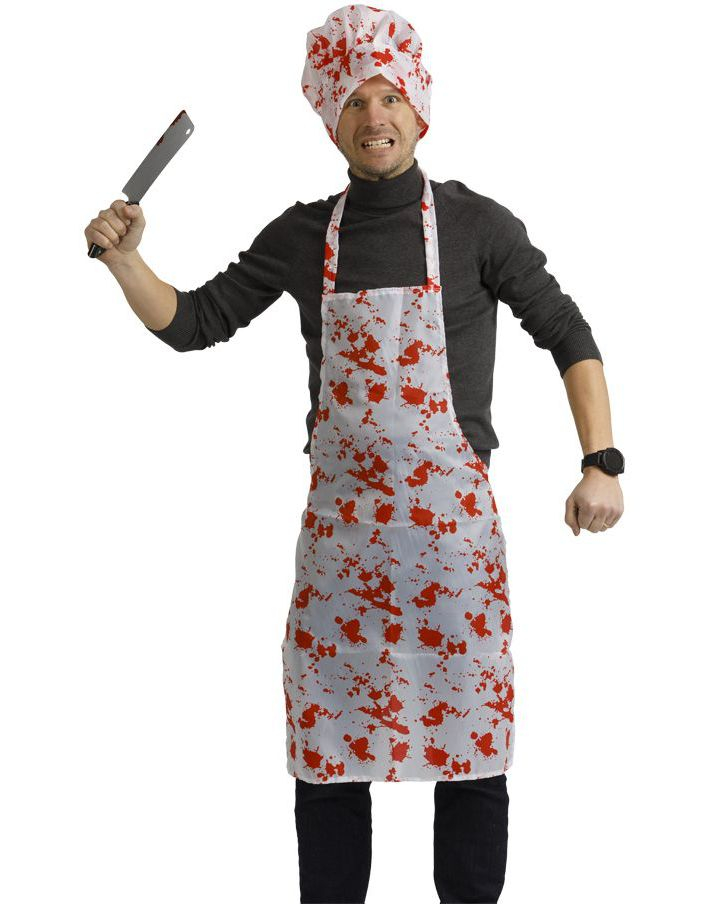 Blodigt Förkläde, Kockmössa Och Köttyxa Set