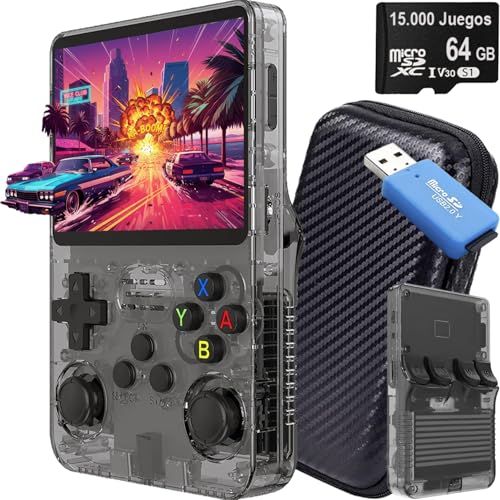 R36S Retro bärbar konsol med 15 000 spel +25 64 GB emulatorer - Mini bärbar konsol, konsoler: PS1, PSP, N64, NDS... 3,5" HD IPS 640 x 480-4 Core 1,6 GHz och 1 GB RAM (svart)