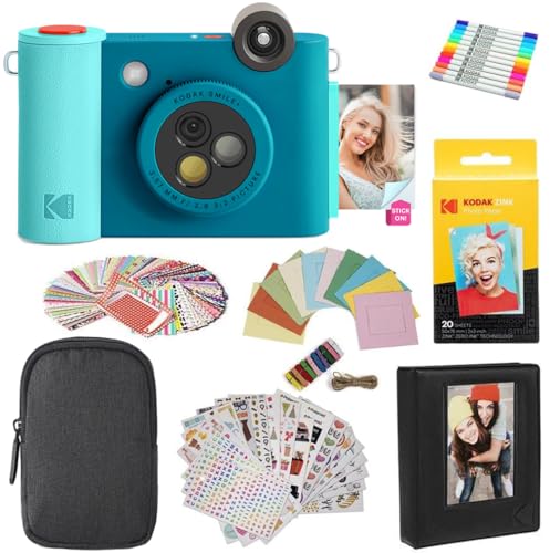 KODAK Smile+ 2-in-1 Digital Instant Camera & Photo Printer Starter Bundle - Case + Zink 20pk Paper - 10MP, Rotating Lens - Blue