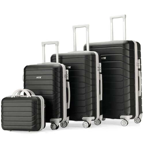 PROVITERA Set med 4 hårda ABS-väskor med kosmetikfodral, resväska med teleskopiskt handtag och lättrullande hjul, vagn med lås och kodlås, handbagage modern design, Svart, 50 x 28.5 x 75 cm, Modern