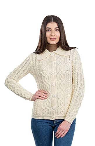 SAOL Irländsk cardigan tröja för kvinnor, 100 % merinoull, aran, keltisk, stickad damkappa med fickor, Naturligt, XXL