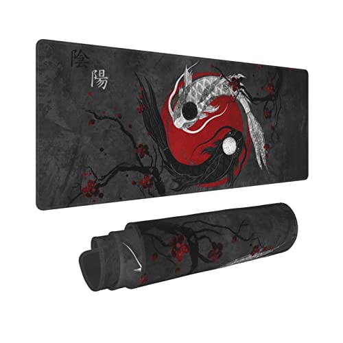 Japansk yin och Yang Koi karp fisk svart röd musmatta XL utökad skrivbordsmatta, halkfri gummibas sydd kant spel pc skrivbord stor musmatta, 80 x 30 cm