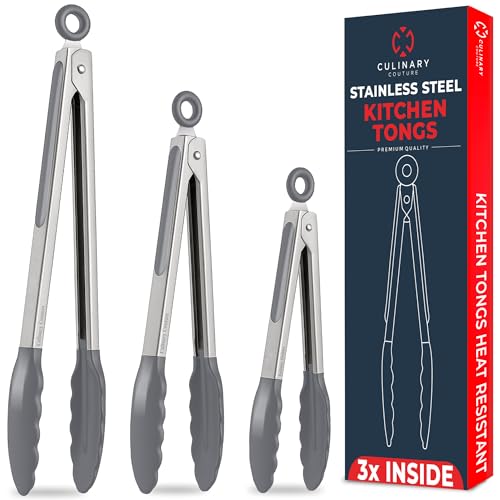 Grå rostfritt stål silikon kökstång och kökstång – uppsättning av 3 tång för kök – 18 x 23 x 30,5 cm