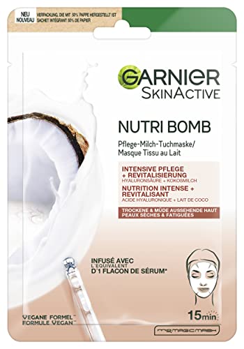 Garnier tygmask, ansiktsmask för torr och trött hud, intensivvård och vitalisering, vegansk formel med kokosmjölk och hyaluronsyra, nutribomb, 28 g