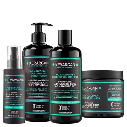 Kerargan - Hydrerande Set Schampo, Balsam, Mask & Serum med Kokosolja - Komplett Vård för Utorkat, Skadat Hår - Utan Sulfater, GMO, Silikon - 3x500 ml + 100 ml