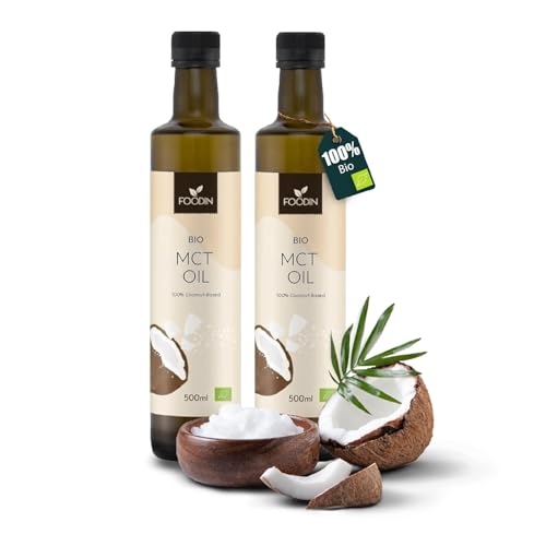 FOODIN BIO MCT-olja 1000 ml (2 x 500 ml) – Tillverkad av 100% kokosolja, medium chain triglycerider, ekologisk, glutenfri, vegansk, idealisk för ketogen kost