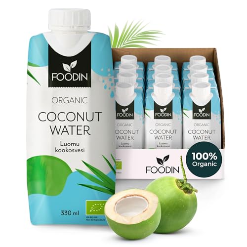 Foodin Ekologiskt Kokosvatten – Naturligt Fuktgivande med Elektrolyter – Fettfritt, Glutenfritt, GMO-fritt, Låg Kalori – Uppfriskande Törstsläckare – 12-pack (12 x 330 ml)