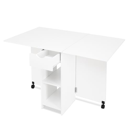 Mondeer Matbord, fällbart köksbord för 4–6 personer, fällbord med låda och 2 öppna hyllor för små rum, matsal, kök, 120 x 72 x 75 cm, vitt