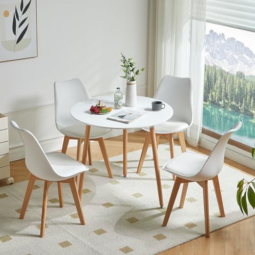 LafeuR Runt matbord med 4 stolar, matgrupper, set om 4 matrumsstolar med köksbord, matsalsgrupp, bordsgrupp för balkong, kök, vardagsrum (vitt bord + 4 vita stolar)