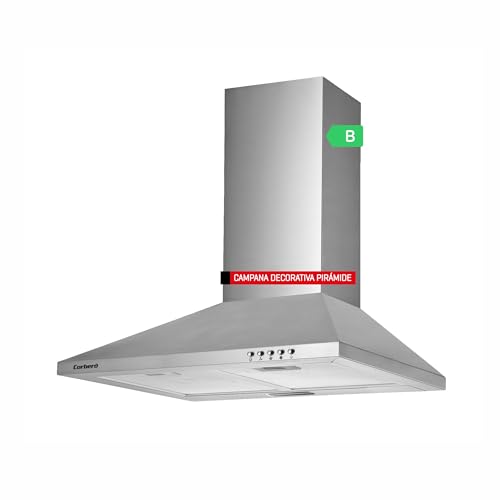 Corberó TEIDE635X Dekorativ köksfläkt, 60 cm, pyramid i rostfritt stål, flödeshastighet 361,9 m³/h, 65 W, 3 hastigheter, 2 aluminiumfilter, kolfilter, energieffektivitetsklass B, rostfritt stål