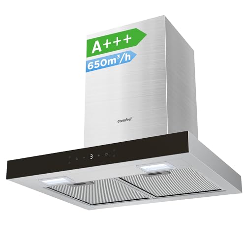 COMFEE' CHW 7,6M77A3 A+++ köksfläkt 60 cm cirkulation/frånluft, fläktar med 650 m³/h stark sugkraft, 4 hastigheter, beröringskontroll och gestkontroll, vägghuva med aktivt kolfilter
