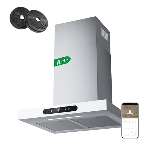 Köksfläkt 60 cm, TopStrong klass A++ dekorativ köksfläkt 60 cm vit med kolfilter, utomhus vakuering och intern återcirkulation, låg förbrukning, 350 m³/h, 3 nivåer, LED