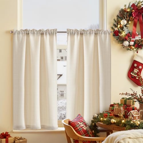 LAMIT Café linnegardiner 76 cm längd för köksfönster över handfat, gräddfärgad elfenben halvgenomskinliga ljusfiltreringspaneler bakflik och stång fickgardiner för litet fönster, 2 paneler, 76 x 76 cm