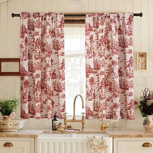 XTMYI Gardiner, 2 st., 122 cm, för köksfönster och badrum, med ficka, blommigt rustikt bondgårdstryck, röd