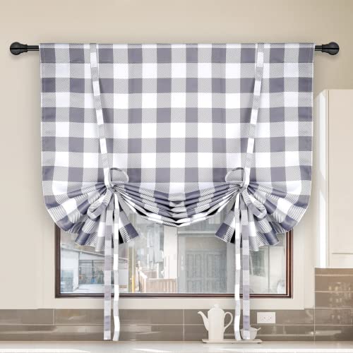 Simple Deluxe Justerbar knytskärm och gardiner för köksfönster, buffellrutigt bondgård värmeisolerat mörkläggningsgardiner för rum, 107 cm B x 160 cm L, vit och grå