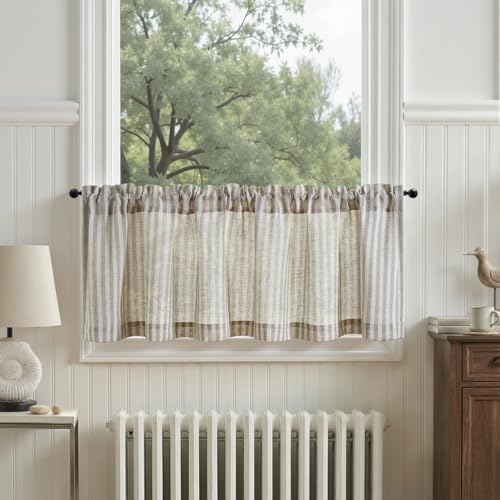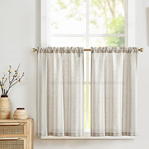 Lazzzy Köksgardiner linne randiga gardiner nivå curatiner cafégardiner för badrum kök bondgård gardiner 91 cm längd stång ficka fönsterbehandling nivåer 2 paneler set brungrå på beige