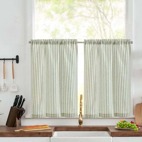 TOPICK Randiga fönstergardiner, linnegardiner med ränder, korta köksgardiner, ogenomskinliga, för kök, matsal och badrum, för litet fönster, 65 x 60 cm (B x H), grön på beige