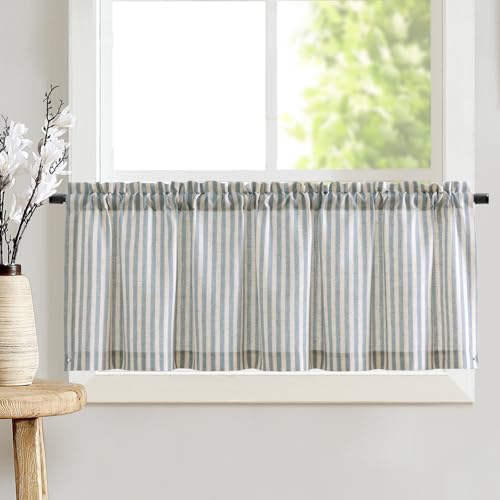 TOPICK Randiga fönstergardiner, linnegardiner med ränder, korta köksgardiner, ogenomskinliga, för kök, matsal och badrum, för litet fönster, 1 st., 125 x 40 cm (B x H), blå på beige