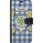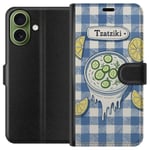 Apple iPhone 17 Plånboksfodral Tzatziki skål grekisk mataffisch dill citron gurka blå rutigt mönster köksinredning vintage stil tryck