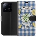 Xiaomi 13 Pro Plånboksfodral Tzatziki skål grekisk mataffisch dill citron gurka blå rutigt mönster köksinredning vintage stil tryck
