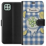 Samsung Galaxy A22 5G Plånboksfodral Tzatziki skål grekisk mataffisch dill citron gurka blå rutigt mönster köksinredning vintage stil tryck