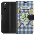 Sony Xperia 10 III Plånboksfodral Tzatziki skål grekisk mataffisch dill citron gurka blå rutigt mönster köksinredning vintage stil tryck