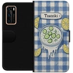 Huawei P40 Plånboksfodral Tzatziki skål grekisk mataffisch dill citron gurka blå rutigt mönster köksinredning vintage stil tryck