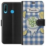 Huawei P30 lite Plånboksfodral Tzatziki skål grekisk mataffisch dill citron gurka blå rutigt mönster köksinredning vintage stil tryck