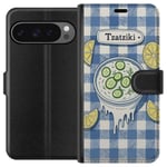 Google Pixel 9 Pro XL Plånboksfodral Tzatziki skål grekisk mataffisch dill citron gurka blå rutigt mönster köksinredning vintage stil tryck