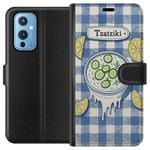 OnePlus 9 Plånboksfodral Tzatziki skål grekisk mataffisch dill citron gurka blå rutigt mönster köksinredning vintage stil tryck