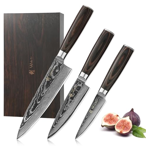 Wakoli EDIB Essentials damaskknivset 3-delad I kockkniv, inkl. Kockkniv och grönsakskniv, universalkniv tillverkad av 67 lager damaskstål VG10 kärna 60±1 HRC I fingerskydd I kökskniv set i trälåda