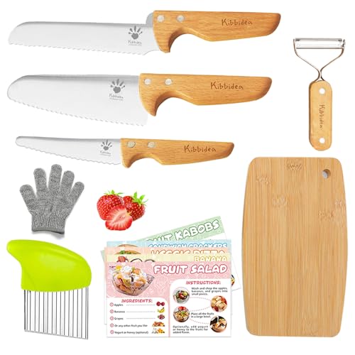 Kibbidea 4-delad barnkniv-Set, barnkockkniv, kökskniv för barn från 3 år och uppåt, träskaft, rostfritt stål, barnkniv för skärning, sågad, barnvänlig