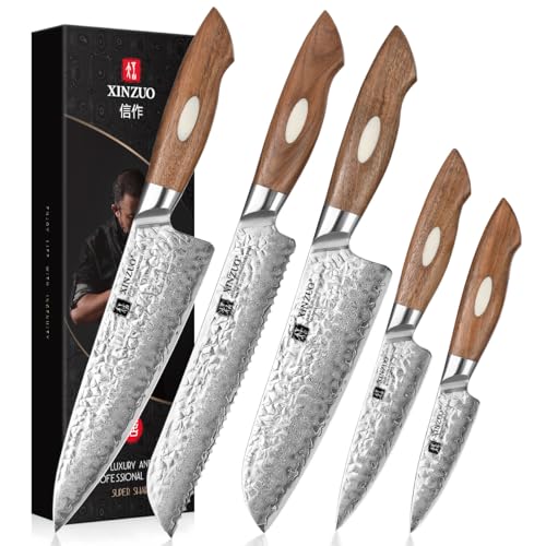 XINZUO 73 lager damaskpulverstål 5-delad kockknivsats, handsmidd vass kockknivsats pulverstålkärna kökskniv set-chef Santoku bröd universal frukt kniv olivolja handtag