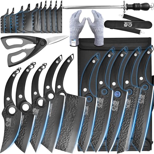 XYJ Professionellt svart kökskniv set med smidda blad med hög kolstål, kockkniv, klyvar, sniderikniv, Nakiri, inkluderar bärväska och fjäderfä sax, presentpåse julklappar