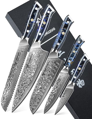 SANMUZUO damaskus stål Knivset med 5, kökskniv set, Professionell Kökskniv kockkniv Grönsakskniv, extremt vasst VG10 damaskskniv med harts handtag, Xuan serie(Stjärnsvart)