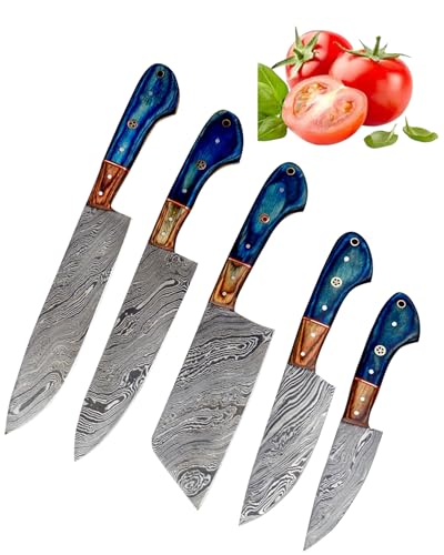 CraftTal Handsmidd damast kökskniv set tillverkat av 67 lager äkta damaskstål med paketkagriphandtag damaskknivset handgjord 5 delar, komplett kökskniv Stamina trä blå
