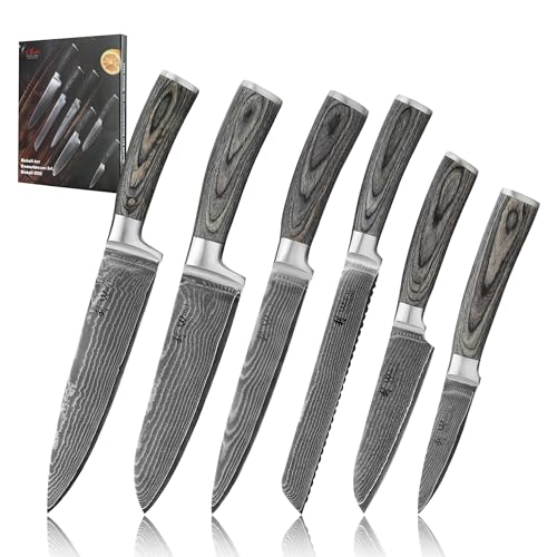 Wakoli EDIS 6-delad damaskus kockknivar | japansk stil professionell kökskniv set med VG10 kärna och ergonomiska pakkawooood-handtag i presentask