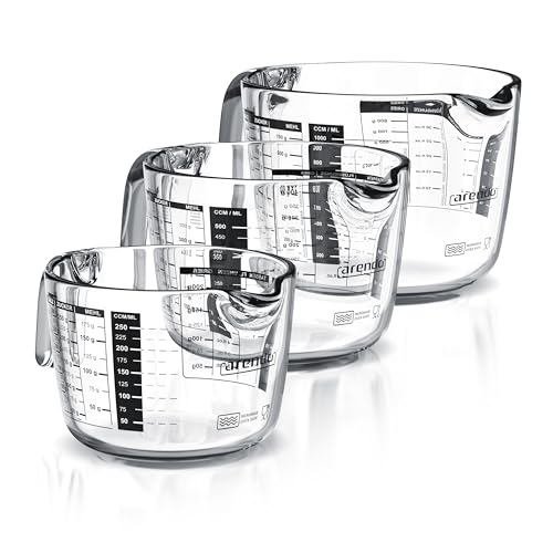 Arendo – mätbägare, set av borosilikatglas – storlekar 1 000 ml, 500 ml 250 ml (1 l 0,5 l 0,250 l) – mätkanna glas och kanna – exakt skala – värmebeständig – lämplig för mikrovågsugnar – kökskniv