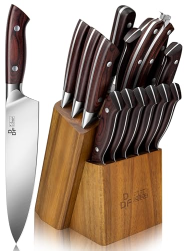 DDF iohEF 16 delar kökskniv set med block, professionellt köksknivset i rostfritt stål med slipmaskin, ultraknivsset med ergonomiskt handtag