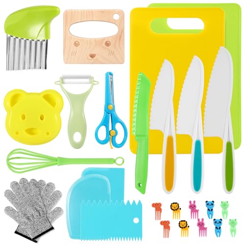 EURYUNG Barnkniv - 17 delar barnsäkerhet köksknivar för riktig matlagning med grönsakskakformar, träkniv, skärbräda etc kniv för barn från 2 år, Montessori-kniv, barnmatlagningsset