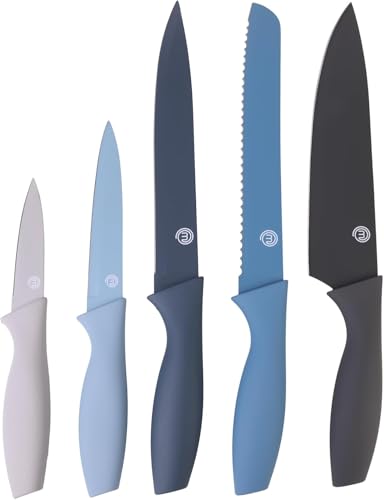 MasterChef Köksknivar, set med kockknivar (kött, brödsåg, grönsaker och fisk), samling i rostfritt stål med mjuka handtag, multifunktionell, 5 delar, blå
