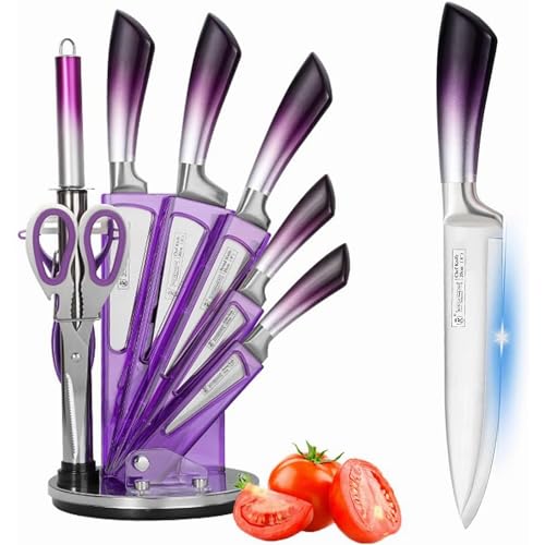 Knivset med knivblocksset, 9 delar lila köksknivar, set med vridbart akrylknivblock, Sharp non-stick belagd kockkniv, blockset med slip, present till flickor (lila)