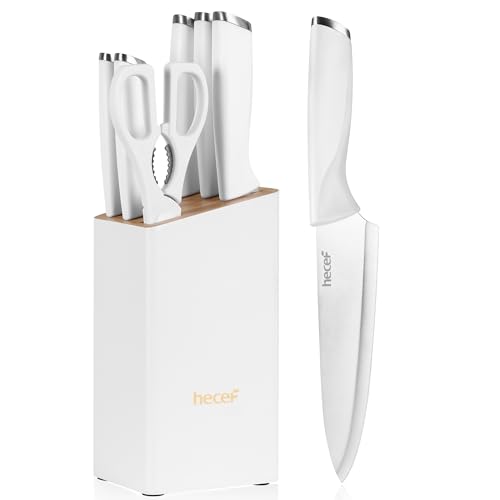 hecef knivblock med knivar, extra vassa köksknivar i rostfritt stål med kökssax, 7‑delars set med block och specialformade handtag för hemmakockar och matentusiaster, vit